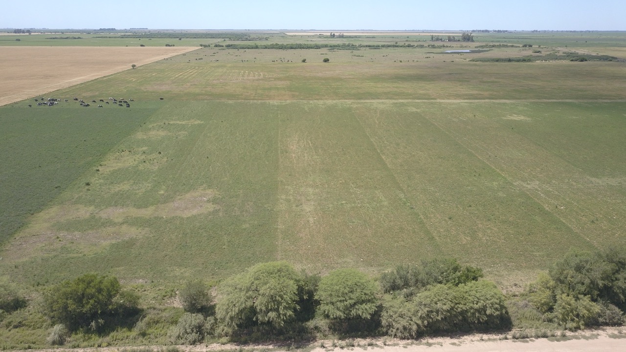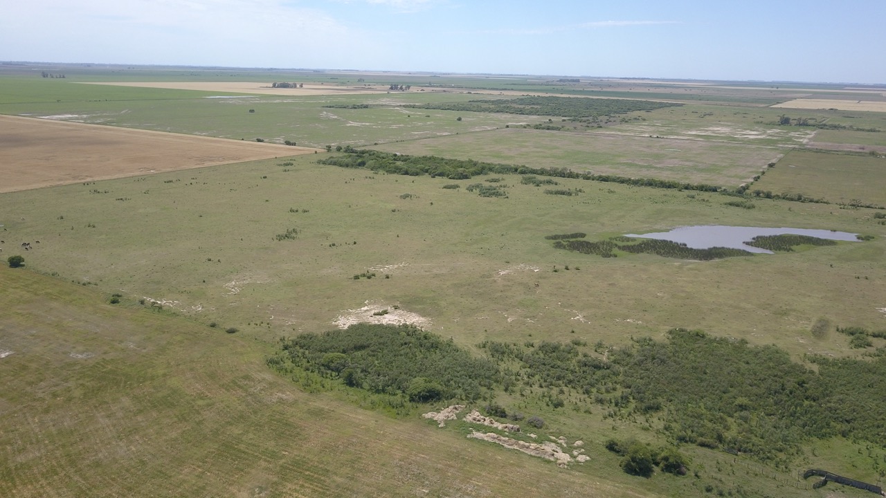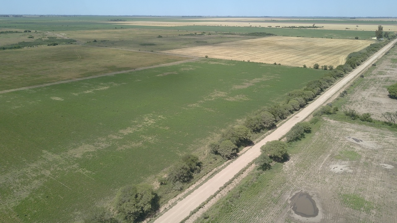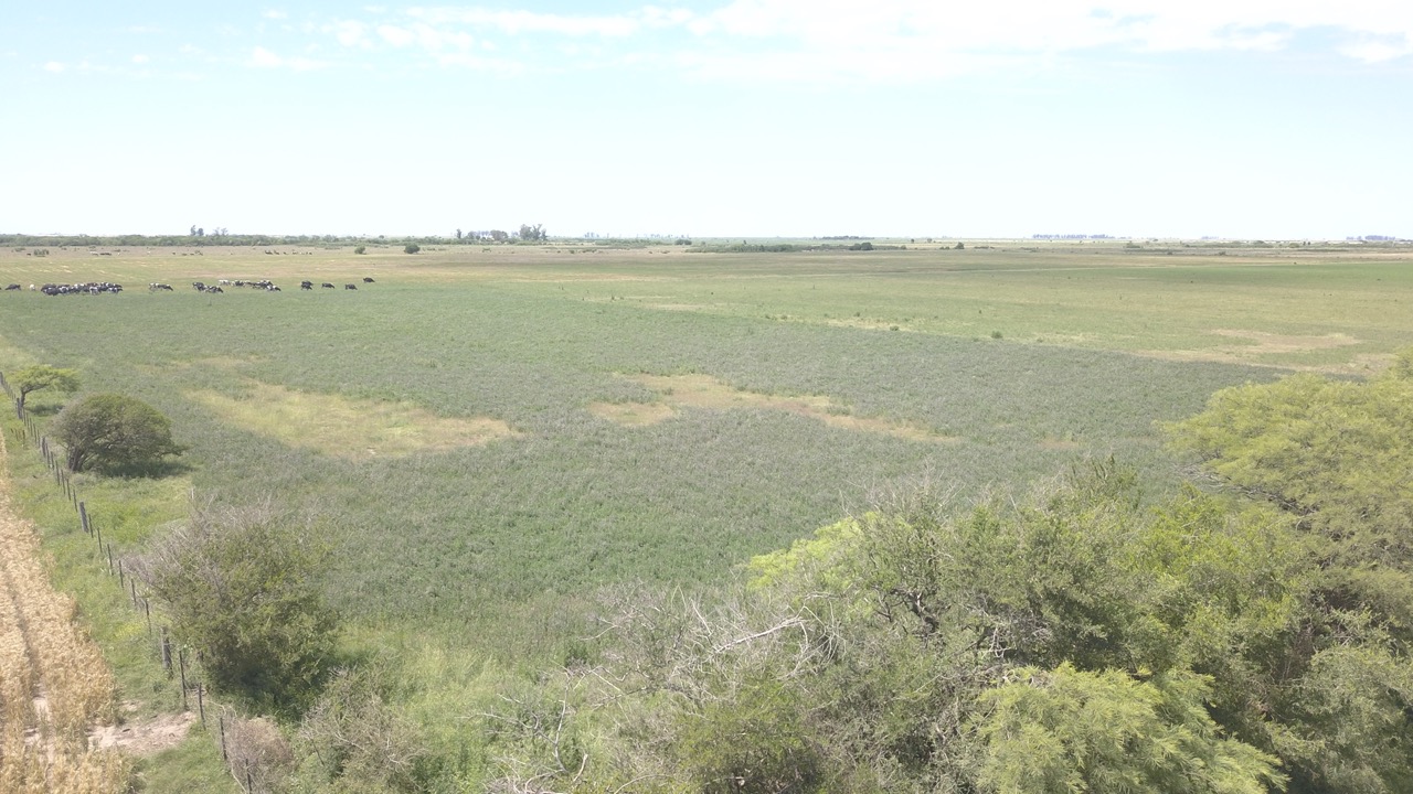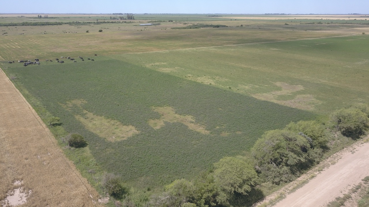 el campo se trabaja un 50% (actualmente con rastrojo de trigo, alfalfa y avena), y el resto se hace ganadería en lotes que no están limpios, ya que cuentan con renovales y poseen sectores bajos, donde se hacen espejos de agua en época de lluvias.)