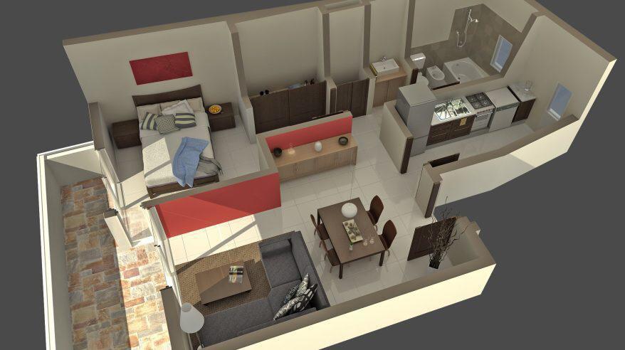 Un dormitorio, cocina separada del estar comedor.